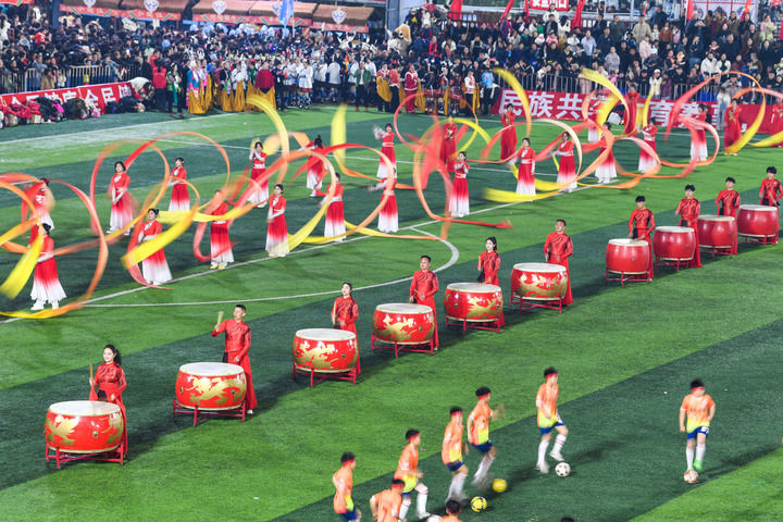 演員在2025年“村超”開幕式上表演節目(2025年1月4日攝)。新華社記者 楊文斌 攝