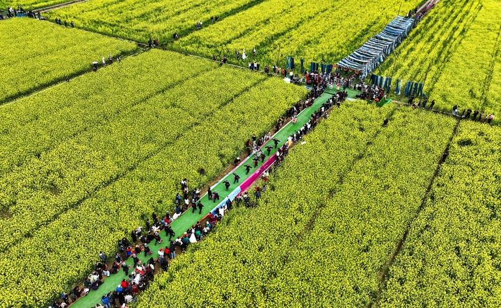 在貴州省榕江縣車江大壩,遊客在觀看民族盛裝花田走秀(2025年3月16日攝,無人機照片)。新華社記者 楊文斌 攝