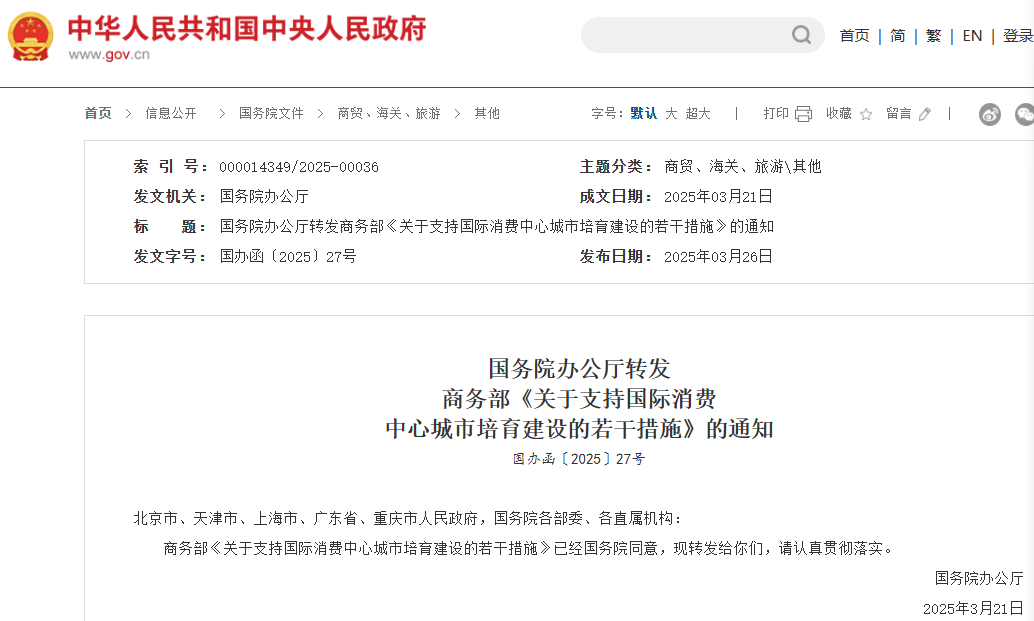 【環球網消費綜合報道】3月26日,國務院辦公廳轉發商務部《關於支持國際消費中心城市培育建設的若干措施》(簡稱《若干措施》),目的在於加快上海、北京、廣州、天津、重慶五個城市國際消費中心城市的培育建設,打造全球消費新高地,全面激發國內市場需求,提升對外開放水平。