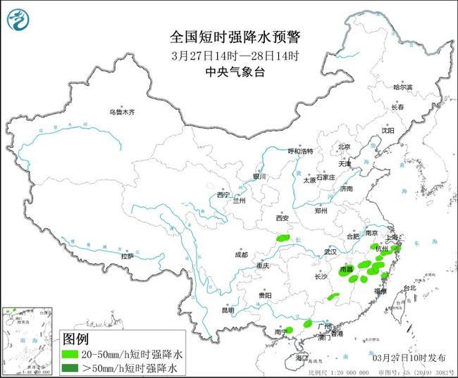 預計3月27日14時至28日14時,安徽南部、浙江南部和東部、江西北部、湖南東南部、福建北部、廣西東南部等地的部分地區將有8級以上雷暴大風或冰雹天氣;浙江、福建北部、江西中部和東北部、湖南東南部、廣西東南部、重慶北部等地的部分地區將有小時雨量大於20毫米的短時強降水天氣。