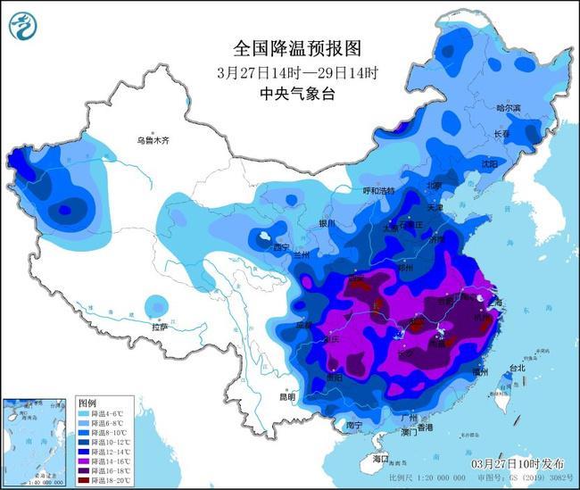 預計,3月27日14時至29日14時,新疆南疆盆地、西北地區中東部、內蒙古中東部、華北西部、黃淮、江淮、江漢、江南、華南大部以及四川東北部、重慶東北部、貴州東部、黑龍江中東部、吉林東部等地將降温8℃~10℃,其中,新疆南疆盆地、甘肅中部、華北西部、黃淮、江淮、江南、華南北部、貴州東部等地部分地區降温可達12℃~16℃,局地超過18℃。