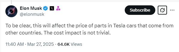 馬斯克還在另一條相關帖文下評論稱,“這將影響來自其他國家的特斯拉汽車零部件的價格。成本影響不容小覷。”