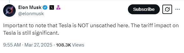 馬斯克在回覆相關帖文時表示,“值得注意的是,特斯拉並非毫髮無損。關税對特斯拉的影響仍然很大。”