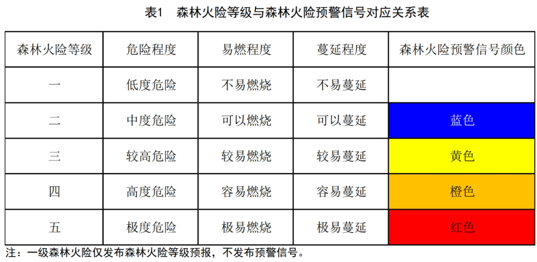 按照《森林火險預警信號分級及標識》規定,我國將森林火險按森林可燃物的易燃程度和蔓延程度進行分級,表示發生森林火災危險程度的指標,共分為五級,自一級至五級,危險程度逐級升高。