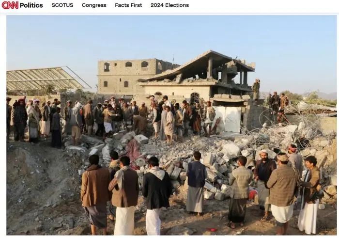 也門民眾聚集在一處空襲現場。圖/美國有線電視新聞網