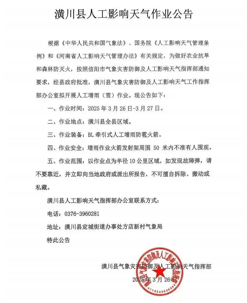 根據《中華人民共和國氣象法》《人工影響天氣管理條例》和《河南省人工影響天氣管理條例》等有關規定,按照信陽市氣象災害防禦及人工影響天氣指揮部通知要求,經縣政府批准,擬於2025年3月26日至27日組織開展森林防滅火人工增雨作業。現將開展人工增雨作業有關事項公告如下: