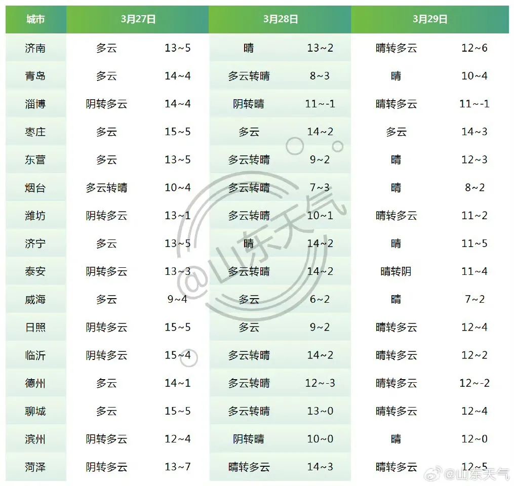 棗莊、臨沂和日照天氣多雲間陰局部有陣雨,其他地區天氣多雲;北風,濱州、東營、濰坊、日照、內陸湖面和半島地區5~6級陣風7~8級減弱到4~5級陣風6級,其他地區4~5級陣風6~7級減弱到3~4級。夜間最低氣温:魯中山區和半島內陸地區1℃左右,菏澤6℃左右,其他地區3℃左右。最高氣温:魯中山區和半島地區10℃左右,其他地區15℃左右。