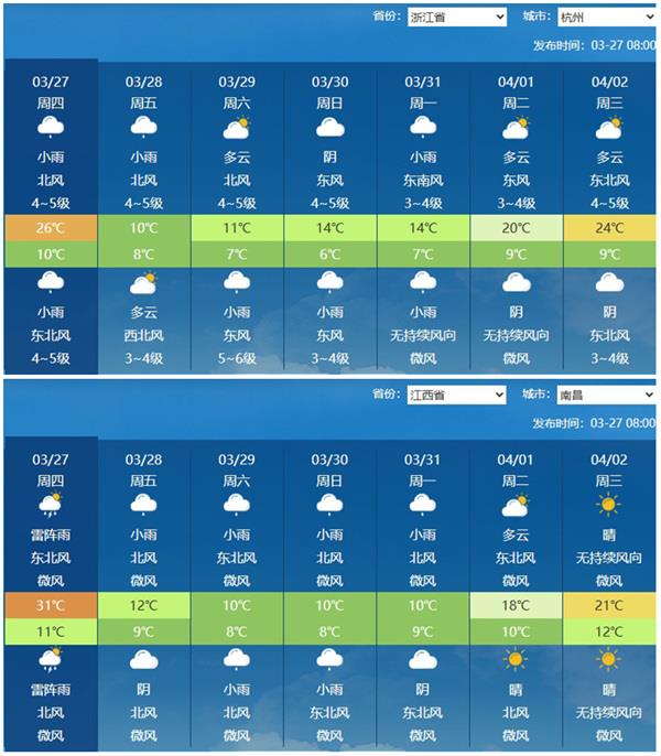 △南昌和杭州的最高氣温將在降雨中降至10℃。