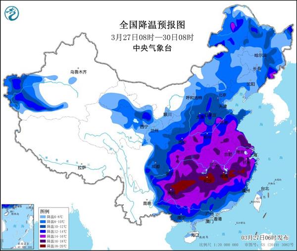 而明後兩天,南方陰雨不斷,氣温持續下降,中央氣象台預計,今天8時至30日8時,河南南部和西部、安徽北部和東南部、江淮東部、江南中北部、貴州中東部等地部分地區降温可達16至18℃,局地降温20℃左右,過程最低氣温將出現在3月29日夜間至30日凌晨,最低温度0℃線將位於華北南部至秦嶺一帶。
