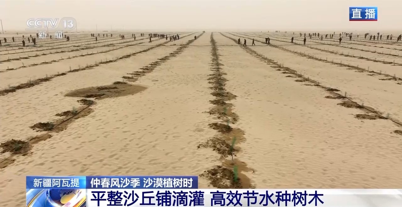 仲春時節,在新疆南疆塔里木盆地,正是綠洲區域麥田返青、杏花盛開的時候,同時也是一年中多風的時節。這兩天,在地處塔克拉瑪干沙漠阻擊戰北部前沿的阿克蘇地區阿瓦提縣,當地幹部羣眾頂着風沙,在塔克拉瑪干沙漠腹地進行植樹防沙工作,總枱記者蘇蒙現在就在一處深入沙漠中的治沙點,那裏的情況怎麼樣,來連線蘇蒙。