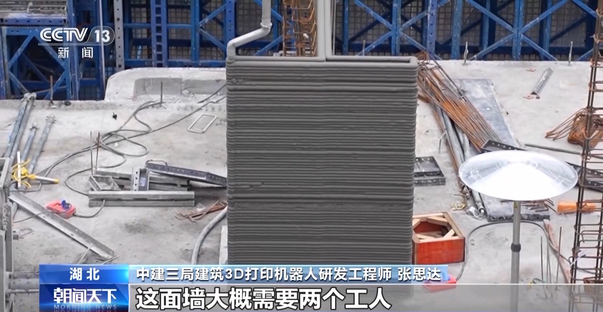 中建三局建築3D打印機器人研發工程師 張思達*:*傳統砌築的話,這面牆大概需要兩個工人,大半天的時間去完成。用我們3D打印的話,兩個多小時就可以完成。