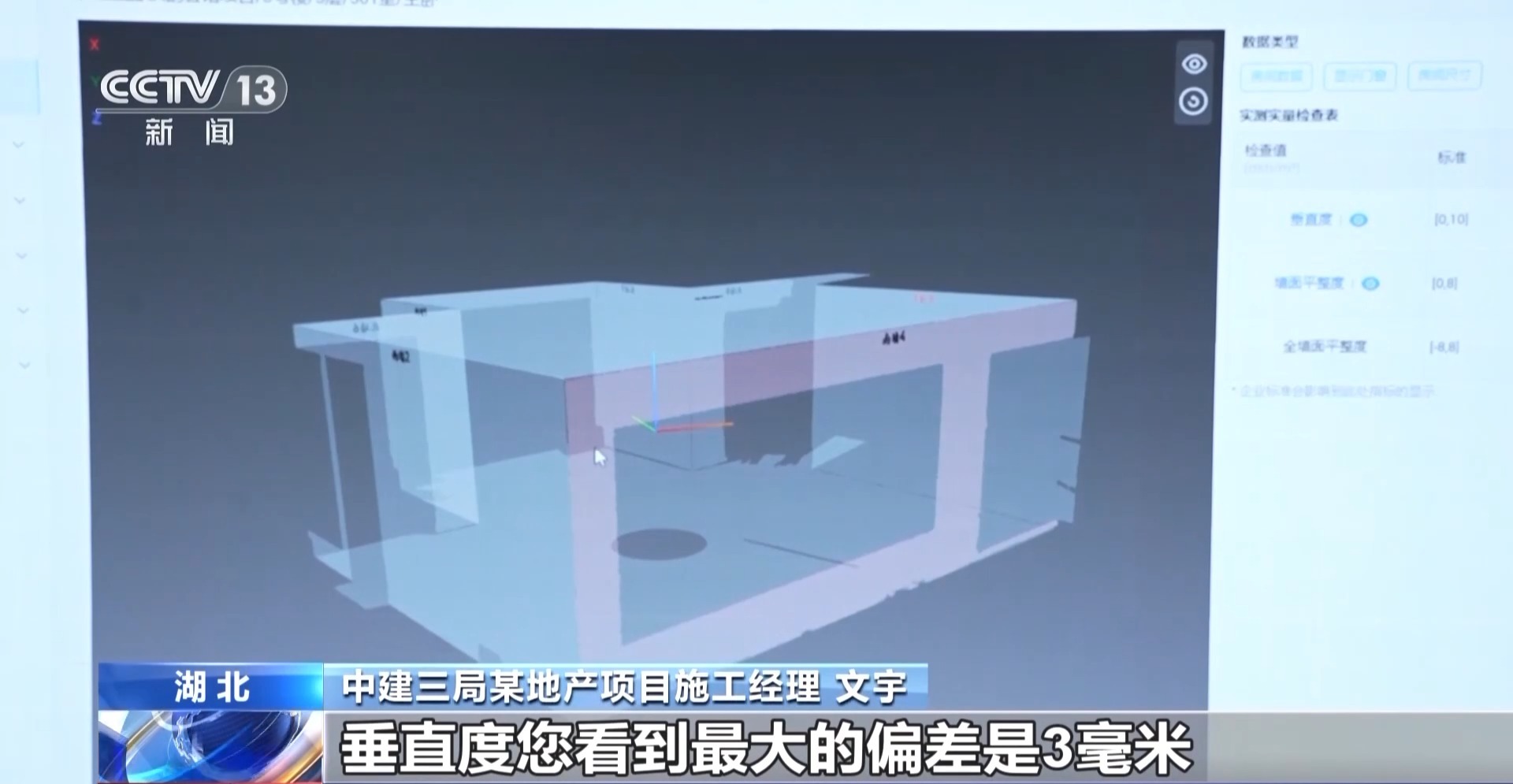 中建三局某地產項目施工經理 文宇*:*垂直度現在偏差最大是3毫米。牆體的垂直度和平整度直接影響到我們後期精裝的質量,所以我們從最開始就對質量進行把控。