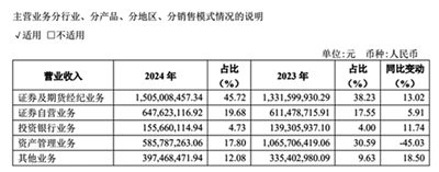 具體來看,不同業務板塊的表現有所分化。其中,證券及期貨經紀、證券自營以及投資銀行業務成為公司主要收入增長動力。2024年,公司證券及期貨經紀業務營業收入為15.05億元,佔2024年度營業收入45.72%,同比增長13.02%;證券自營業務營業收入為6.48億元,佔2024年度營業收入19.68%,同比上升5.91%;投資銀行業務營業收入為1.56億元,佔2024年度營業收入的4.73%,同比上升11.74%。