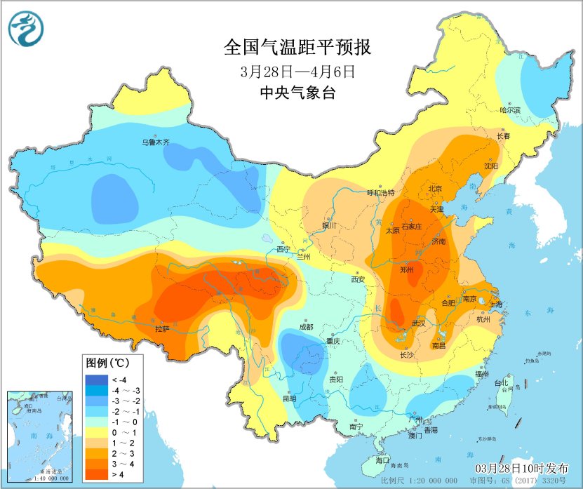 未來10天,東北地區南部、華北、黃淮、江淮、江漢、江南北部及青藏高原等地平均氣温較常年同期偏高1~4℃;新疆、青海、甘肅西部、東北地區北部及西南地區東部、華南等地平均氣温偏低1~3℃;全國其餘大部地區平均氣温基本接近常年。