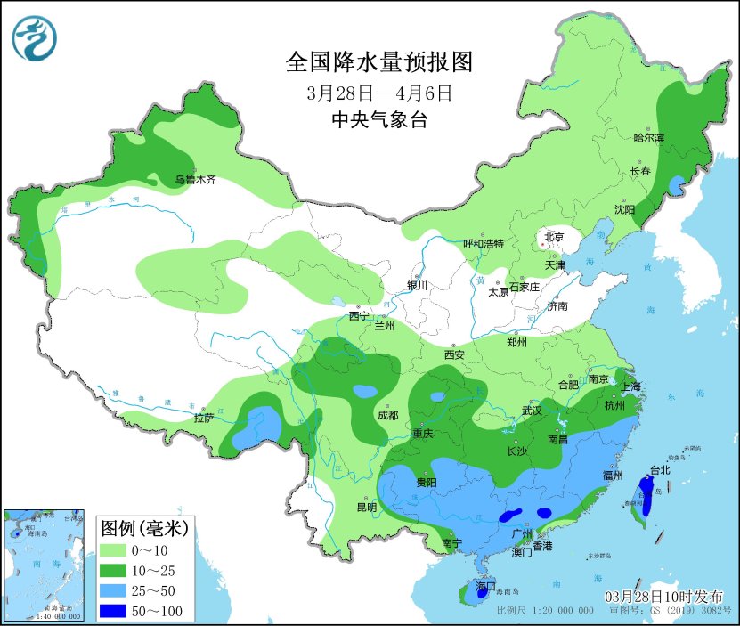 預計未來10天(3月28日至4月6日),新疆西部、內蒙古中東部、東北地區、華北北部累計降水量有3~8毫米,其中新疆沿天山附近、東北地區東部等地的部分地區有10~15毫米,局地超過20毫米。江淮、江南、華南以及西南地區東部等地有10~30毫米,江南局地有40~60毫米。與常年同期相比,全國大部地區降水量偏少。