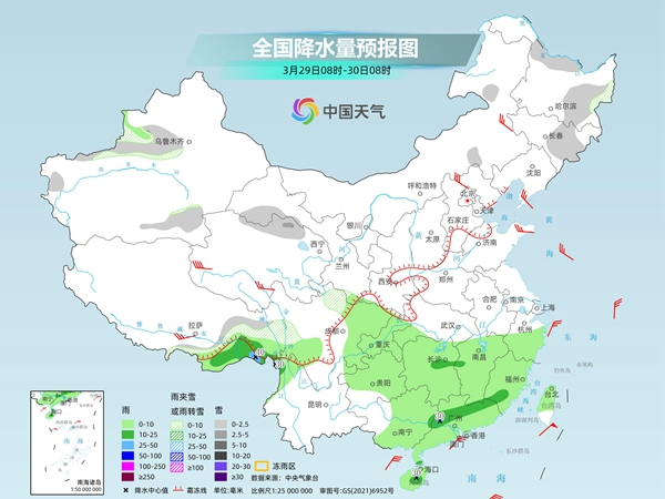 明天,新疆伊犁河谷和南疆盆地、青海北部、甘肅河西、黑龍江北部和東部、西藏東部、川西高原北部等地部分地區有小到中雪或雨夾雪。西藏東部、西南地區東部、江南、華南大部、台灣島等地部分地區有小到中雨,局地有大雨。