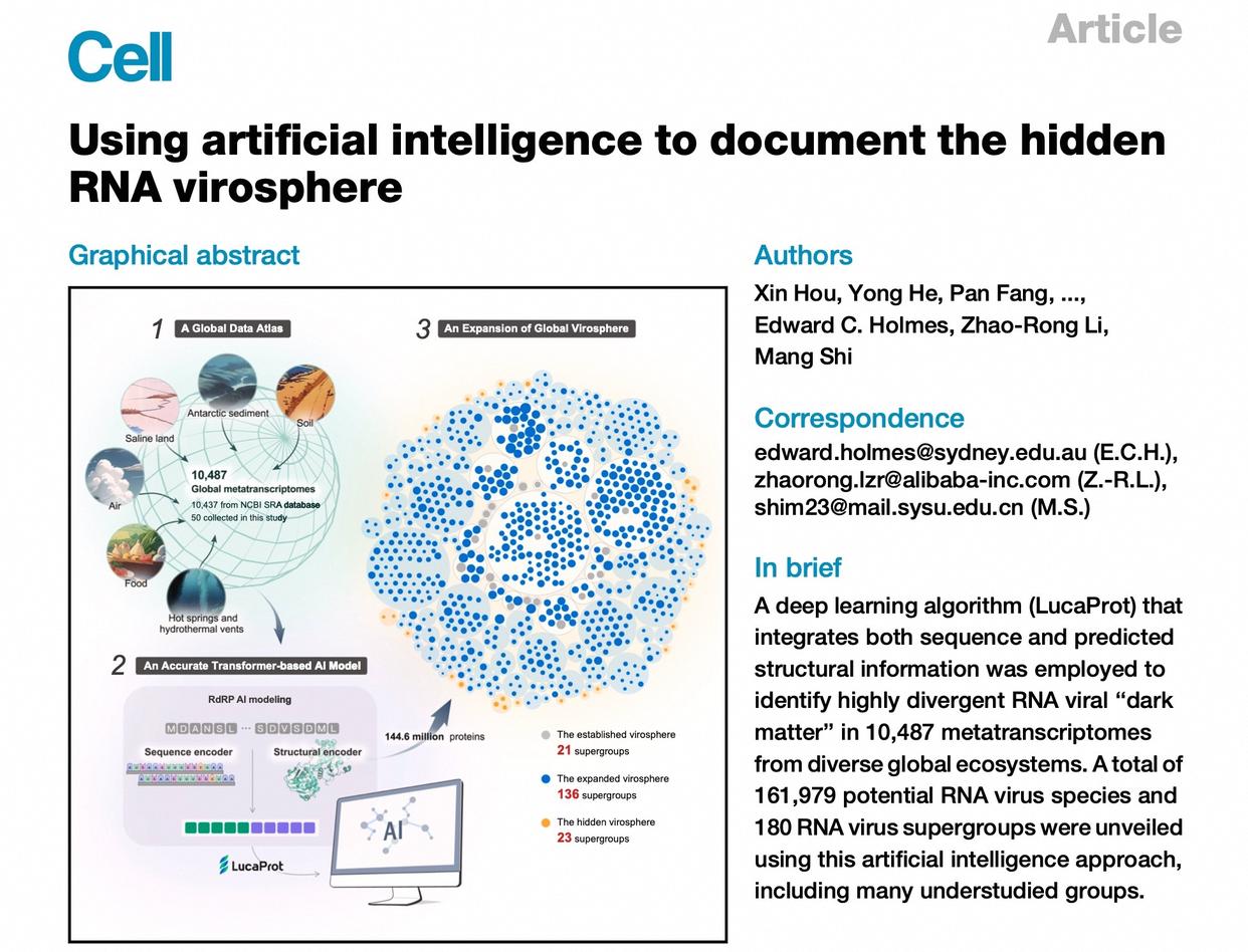 在本次入選的研究成果“Using artificial intelligence to document the hidden RNA virosphere”中,阿里雲和中山大學研究團隊創新性將AI應用於病毒發現領域,提出了全新的深度學習模型"LucaProt",該模型基於Transformer架構,在病毒發現的準確率、效率及檢測病毒多樣性上均優於傳統方法,有效解決了缺乏同源性或同源性極低的“暗物質病毒”發現效率低的難題。