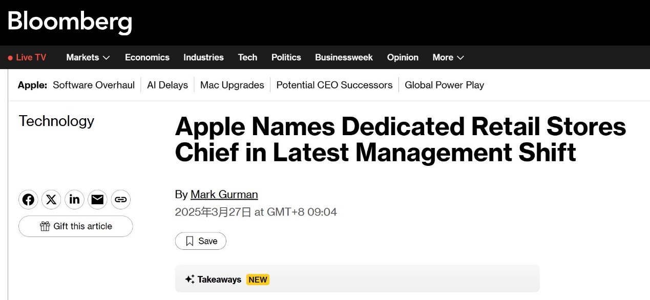 【環球網科技綜合報道】3月18日,據彭博社記者馬克・古爾曼報道,蘋果公司正在對其領導層結構進行一系列調整,並新設了 “全球零售主管” 職位。此次調整是蘋果公司近期第二次重大管理層變動,顯示出其在零售業務和組織架構上的戰略調整。