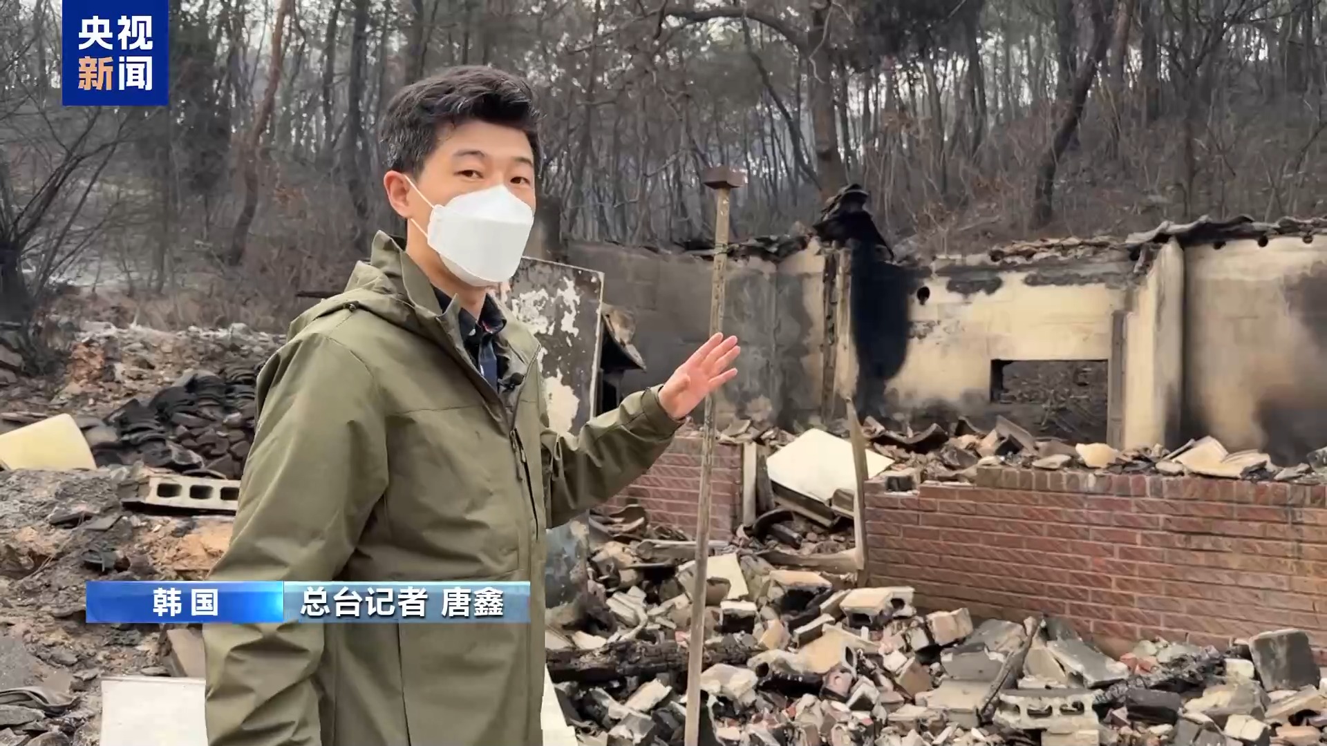 *總枱記者 唐鑫:*在我身後就是慶尚北道安東市近郊的一處村落。通過我們的鏡頭可以看到,在這場山火中,這個村子大部分建築已經在大火中被完全燒燬,建築的磚瓦現在散落一地,我身後的樹林也有明顯的過火痕跡。我們來到這裏的時候,村子裏的人員已經被疏散到了臨近的安置點,所以我們在村子裏沒有看到當地的村民,沒有辦法直接問他們火災來臨時的情況。不過從現場隨處可以看到的焦黑的痕跡,可以想象火災來臨的時候場景有多麼可怕。