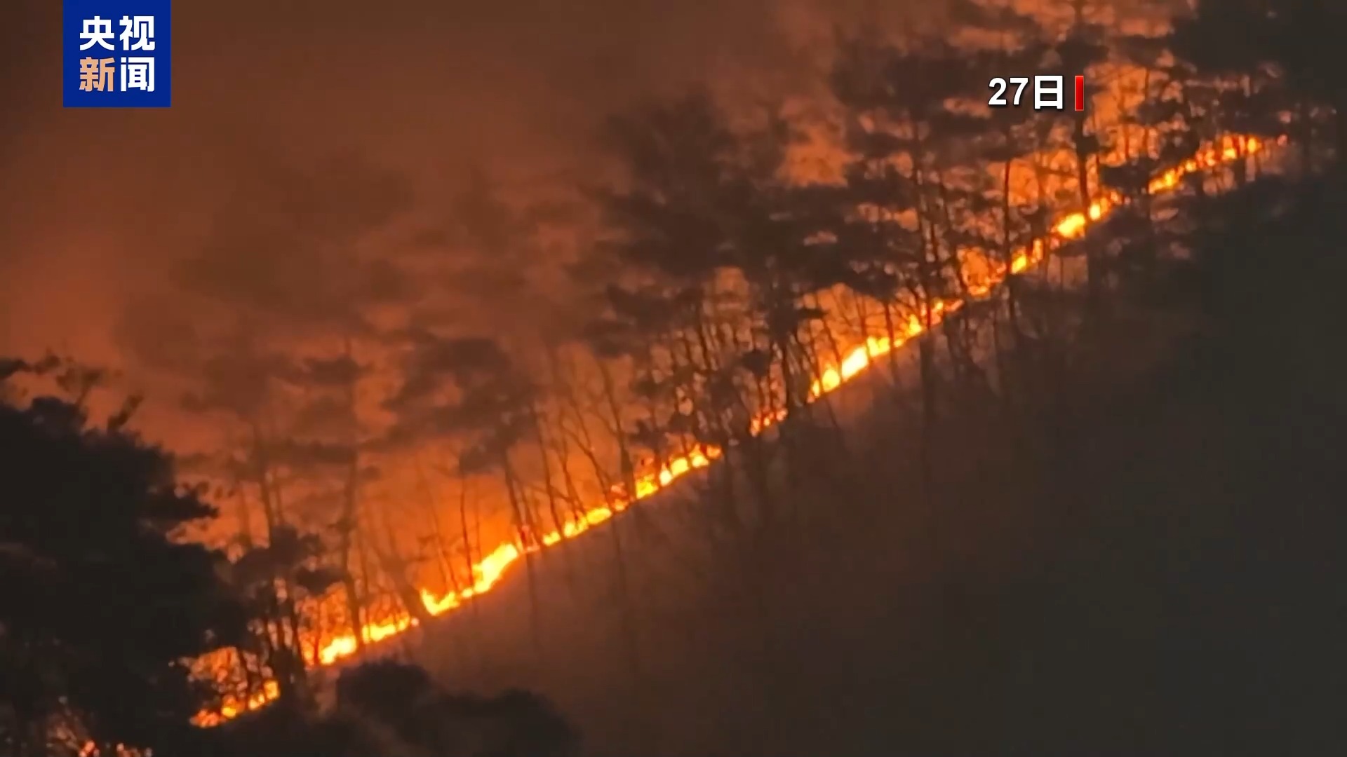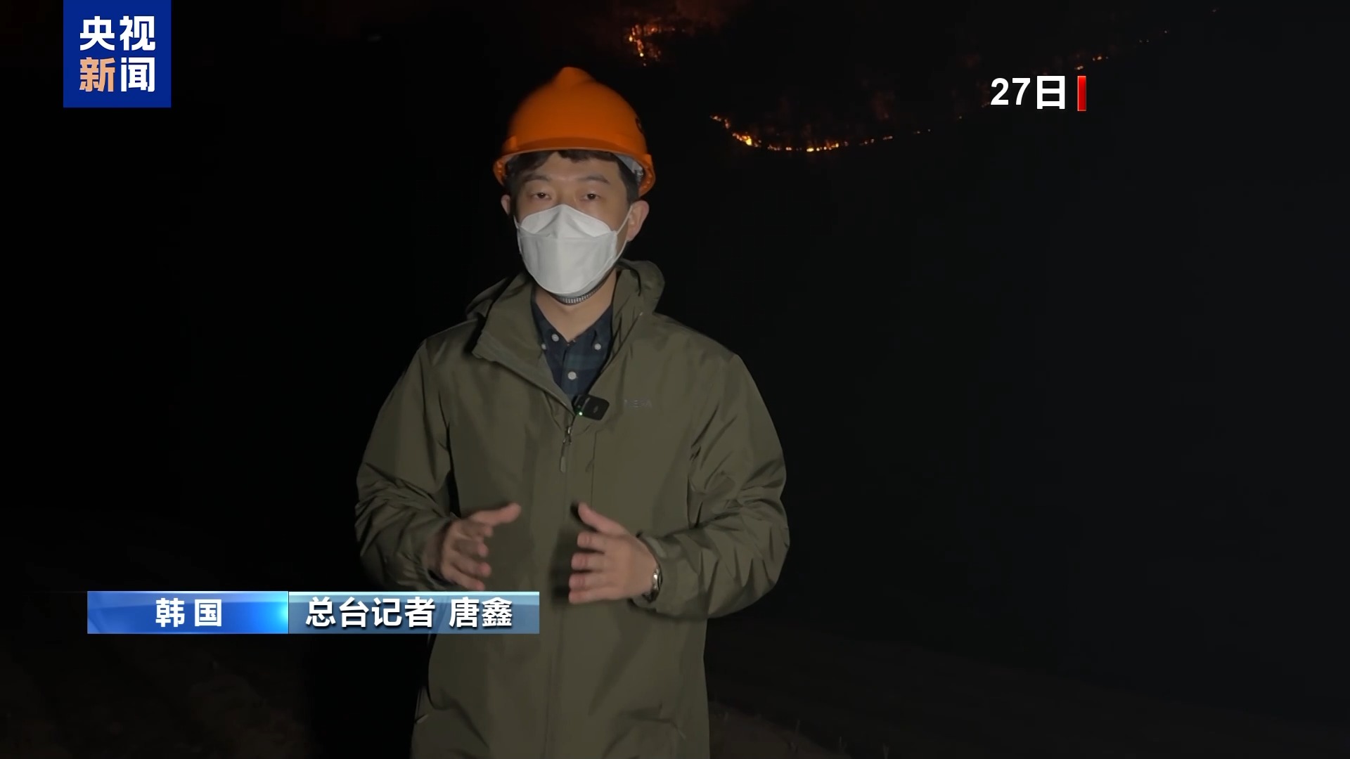 *總枱記者 唐鑫:*我現在所在的位置位於慶尚北道青松郡的一處山火蔓延現場。通過我們的鏡頭可以看到,在我身後幾百米遠的山林中有一條清晰的火線。現在是當地時間27日22時,現場的消防救援人員介紹,所幸我們所在的地方風勢沒有很大,否則很快火線就會蔓延至整個山林,進而威脅山腳下的村莊。現在是夜間,消防救援直升機沒法出動,地面救援人員表示,僅靠地面救援力量,很難控制住這樣長達數公里的火線。對於現在這樣的山火蔓延,基本處於束手無策的狀態。