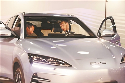 在匈牙利首都布達佩斯舉行的比亞迪某新款新能源汽車發佈會上,嘉賓在瞭解車輛性能。