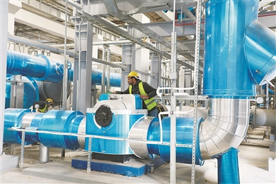 埃及新行政首都中央商務區項目能源中心設置的變頻空調水泵,為空調系統循環提供動力,通過變頻調節實現節省電能的目的。圖為工作人員對水泵進行檢查和維護。