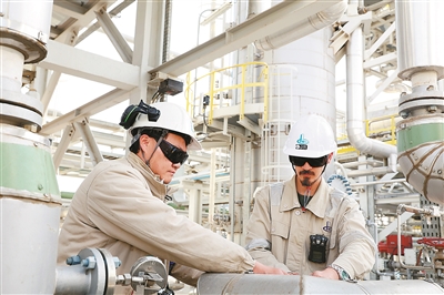 伊拉克哈法亞天然氣處理廠項目由中國石油工程建設有限公司承建,主要功能是收集和處理哈法亞油田3箇中心油氣處理廠的伴生氣和凝析液,有效減少該地區油田伴生氣放空燃燒,從而保護環境。圖為中方技術人員帶領當地員工對現場調節閥進行檢測。