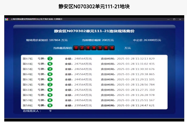 3月28日,上海2025年第三批次土地出讓交易活動正在進行。其中,熱度最高的是靜安區推出的N070302單元111-21地塊,屬於大寧板塊優質宅地,當天上午經過9名競買人67輪競價,最終以溢價率32.3%、總成交價24.8564億元,由大華集團旗下的上海華楊房地產開發有限公司摘得。