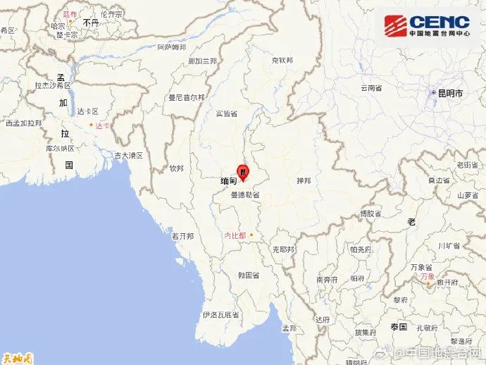 繼7.9級地震後,3月28日14時32分在緬甸(北緯21.60度,東經95.95度)發生6.4級地震,震源深度30千米。