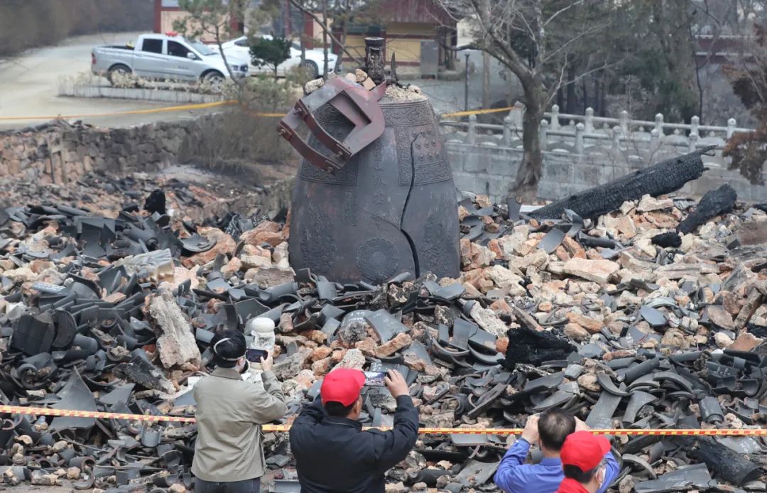 3月27日,在韓國慶尚北道義城郡,民眾拍攝大火過後的古寺孤雲寺廢墟。新華社記者姚琪琳攝