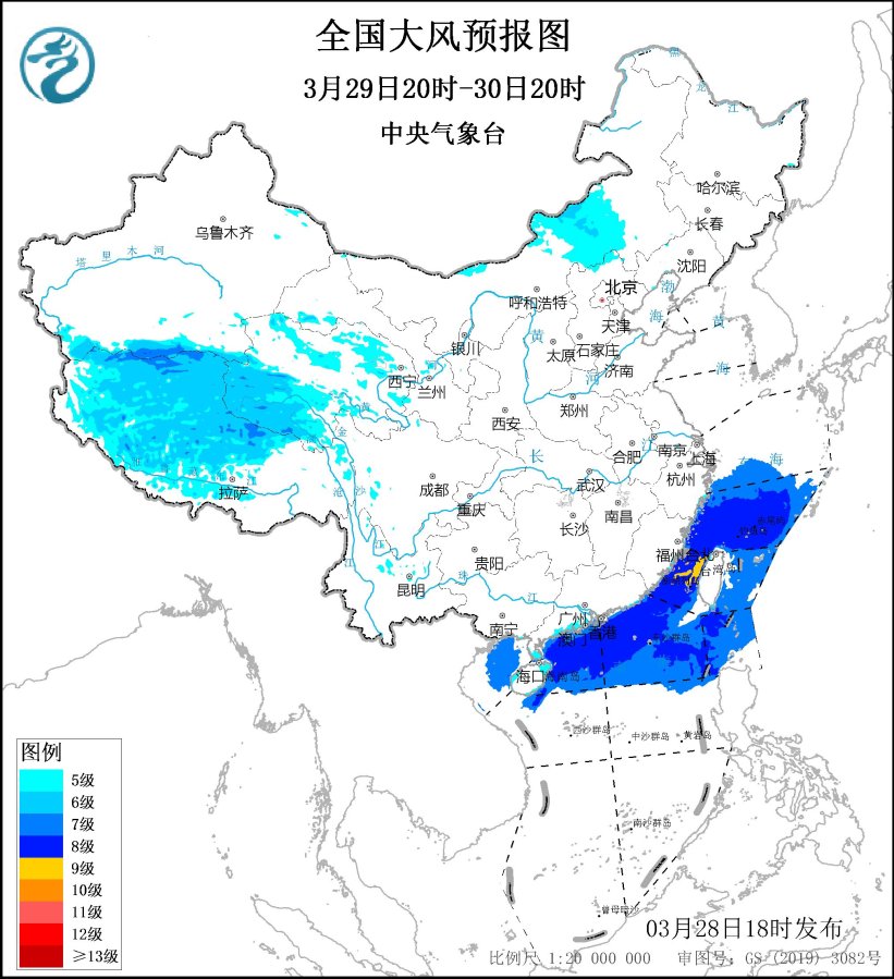 3月29日20時至30日20時,內蒙古中部、西藏中西部和北部、青海南部、海南島、台灣島等地有5~6級風、陣風7~8級,其中,西藏中西部和北部、青海西南部等地部分地區有7級、陣風8~9級的大風;東海南部海域、台灣海峽、台灣以東洋麪、巴士海峽、南海北部海域、北部灣將有7~8級、陣風9級的大風,其中台灣海峽部分海域風力可達9級、陣風10級。