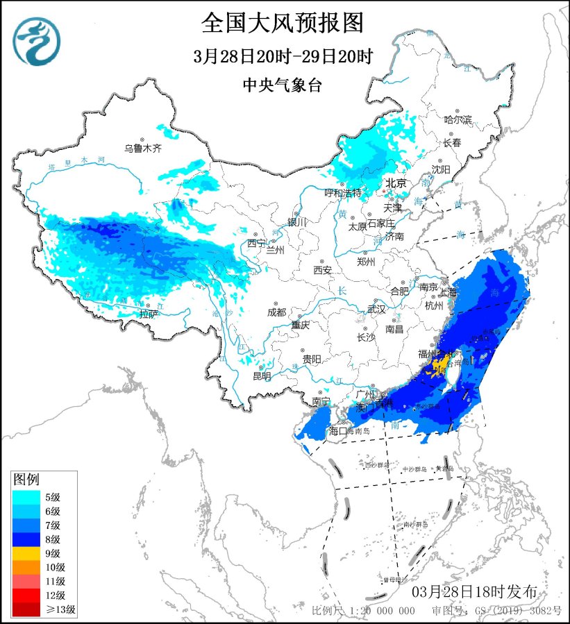 預計,3月28日20時至29日20時,內蒙古中東部、河北北部、西藏中北部、青海南部和西部、甘肅河西、川西高原北部、台灣島等地有5~6級風,陣風7~8級,其中,西藏北部、青海西南部等地部分地區有7~8級、陣風9~10級的大風;東海大部海域、台灣海峽、台灣以東洋麪、巴士海峽、南海北部海域、北部灣將有7~8級、陣風9級的大風,其中台灣海峽部分海域風力可達9級、陣風10級。
