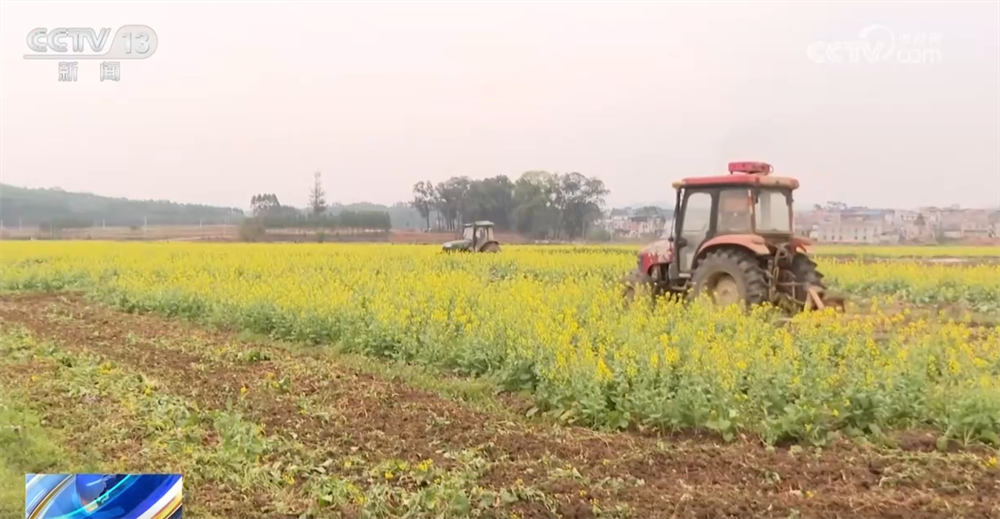 與其他地方榨油的油菜花不同,這裏種植的油菜花除了觀賞,更重要的是還田做綠肥,為即將栽插的水稻做準備。目前,當地已陸續進入早稻插秧時節,趁着花開正盛,旋耕機正在花田中進行壓青作業。