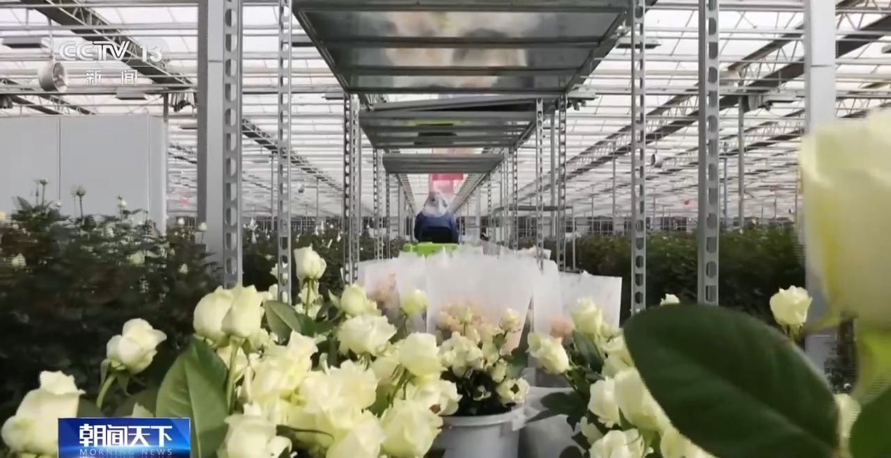 玫瑰的養分和水從何而來呢?奧秘就是懸掛在温棚裏的傳感器。張曉亮介紹説,它們就像偵察員,會蒐集周邊環境的光照、濕度等信息,而後台車間根據大數據,就可以對水和肥料進行配比,通過這些細管實現自動滴灌。