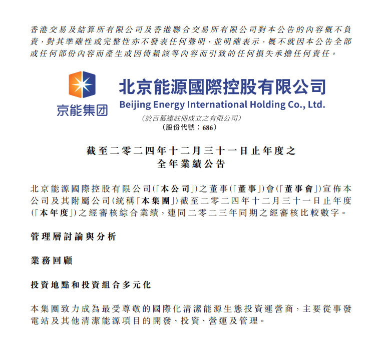 北京能源國際2024年業績:總裝機近1500萬千瓦,資產超1000億元