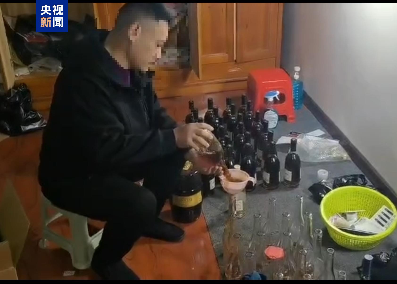 城郊的爛尾樓內,灌裝、封口、貼標、包裝一氣呵成,成本不到50元一瓶的灌裝洋酒幾經週轉,最終被犯罪團伙包裝成了上千元的假冒品牌洋酒。