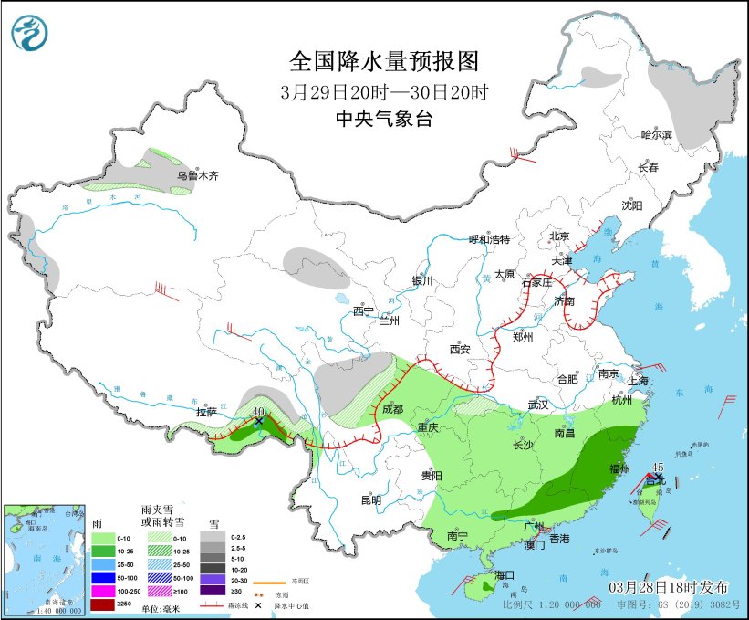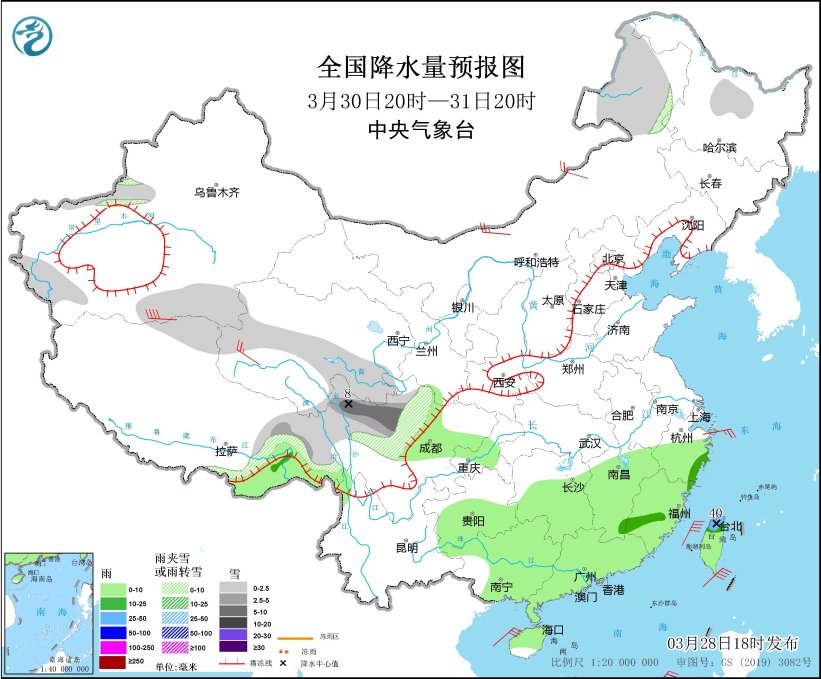 *3月29日20時至30日20時,*內蒙古東北部、黑龍江西北部、新疆沿天山地區和伊犁河谷、西藏東部、青海北部和東南部、甘肅西南部、湖北南部、西南地區北部等地部分地區有小雪或雨夾雪,其中,西藏東南部等地部分地區有中雪。西藏東部、江南、西南地區東部、雲南東南部、華南、台灣島等地部分地區有小到中雨,其中,西藏東南部、台灣島北部等地部分地區有大雨(25~45毫米)。內蒙古中部、西藏南部、甘肅南部等地部分地區有4~6級風,其中,西藏北部部分地區有7~8級風;東海大部海域、台灣海峽、台灣以東洋麪、巴士海峽、南海北部海域、北部灣將有7~8級、陣風9~10級的大風(見圖5)。