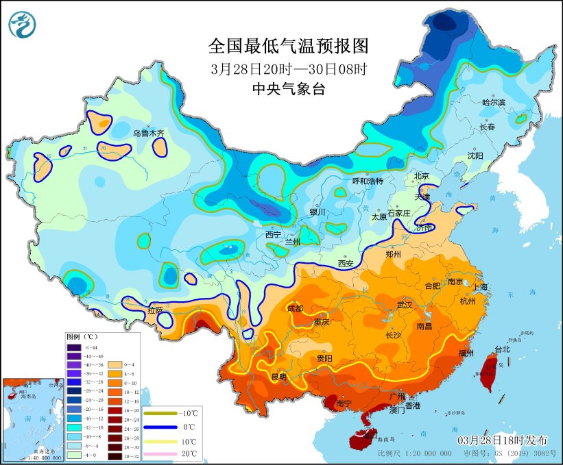 受強冷空氣影響,預計,3月28日20時至3月30日08時,江南中南部、西南地區東南部、華南以及東北地區東部、新疆南疆南部山區等地將先後降温6~8℃,其中,華南南部等地部分地區降温可達10~12℃(見圖1)。過程最低氣温將出現在3月29日夜間至30日凌晨,最低温度0℃線將位於華北南部至秦嶺一帶(見圖2)。中央氣象台3月28日**18時繼續發佈寒潮藍色預警。