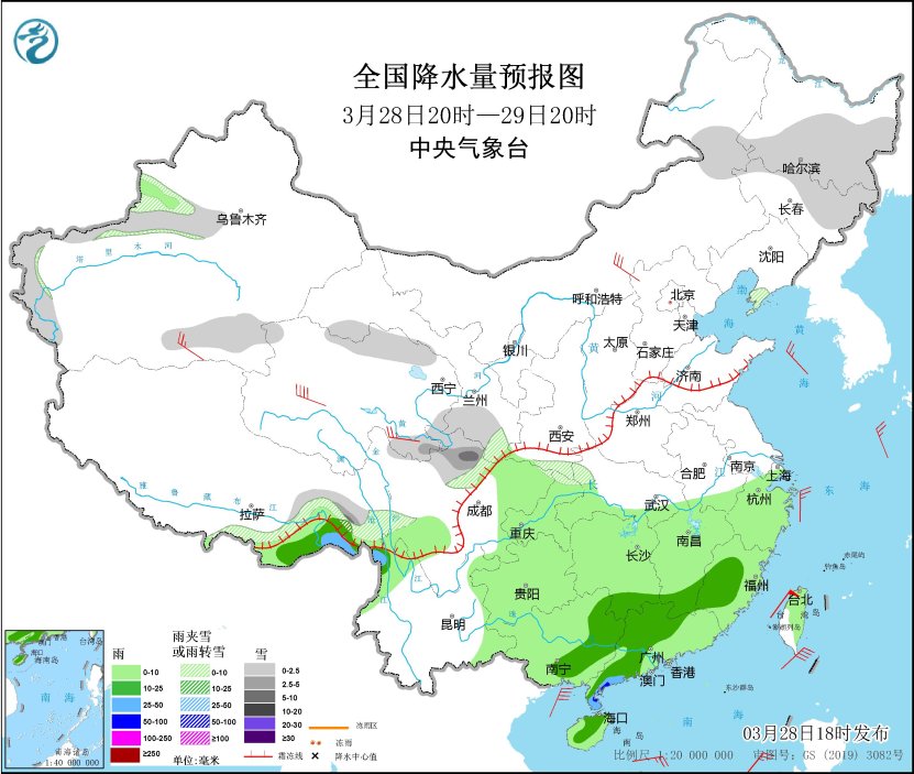 圖4 全國降水量預報圖(3月28日20時-29日20時)