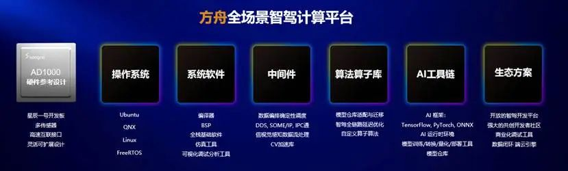 基於“星辰一號”7nm車規芯片,芯擎科技搭建了開放的全場景生態平台:芯擎方舟,分別從芯片基礎能力,操作系統、系統軟件、中間件、算法算子庫、AI工具鏈,生態方案等方面開放賦能,為客户提供一站式的算法開發和端到端的大模型部署,同時具備數據流調優,規劃控制整車適配,以及數據閉環端雲結合的能力。