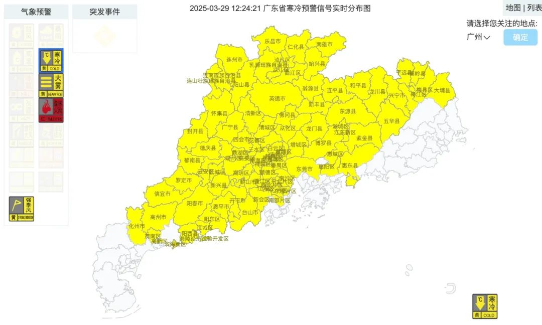 截至29日9時20分,廣州全域啓動寒冷黃色預警。