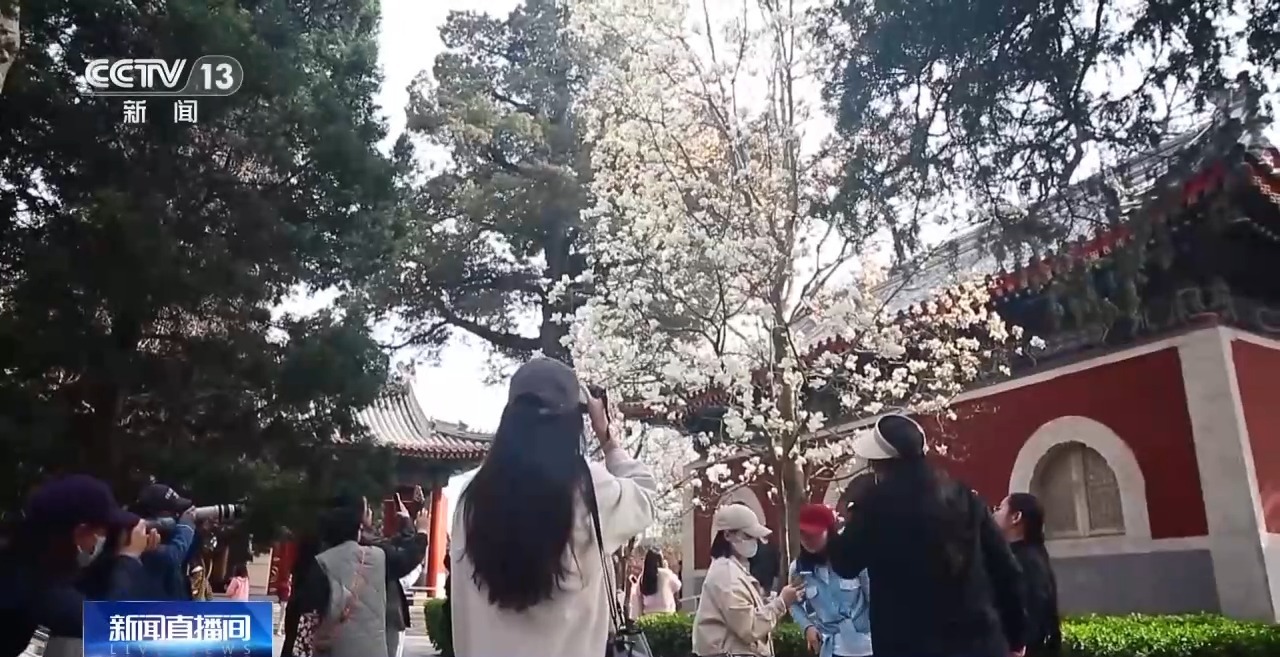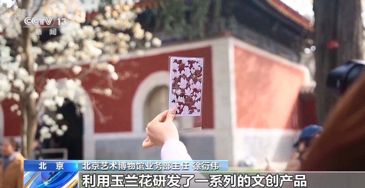 近日,北京萬壽寺內的玉蘭花迎來了盛花期,素淨的玉蘭花在紅牆古建的映襯下韻味十足,賞花拍照的遊客絡繹不絕,以院內玉蘭為原型的文創產品銷售火爆。
