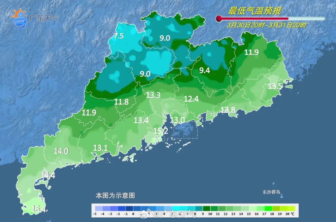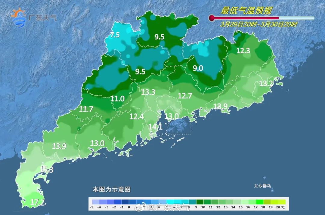 29-30日,粵北和珠三角北部市縣陰天有小到中雨,其餘市縣陰天有小雨,雨霧天氣明顯,晝夜温差小。最低氣温:粵北市縣7~10℃,粵西市縣14~16℃,其餘大部分市縣11~13℃。