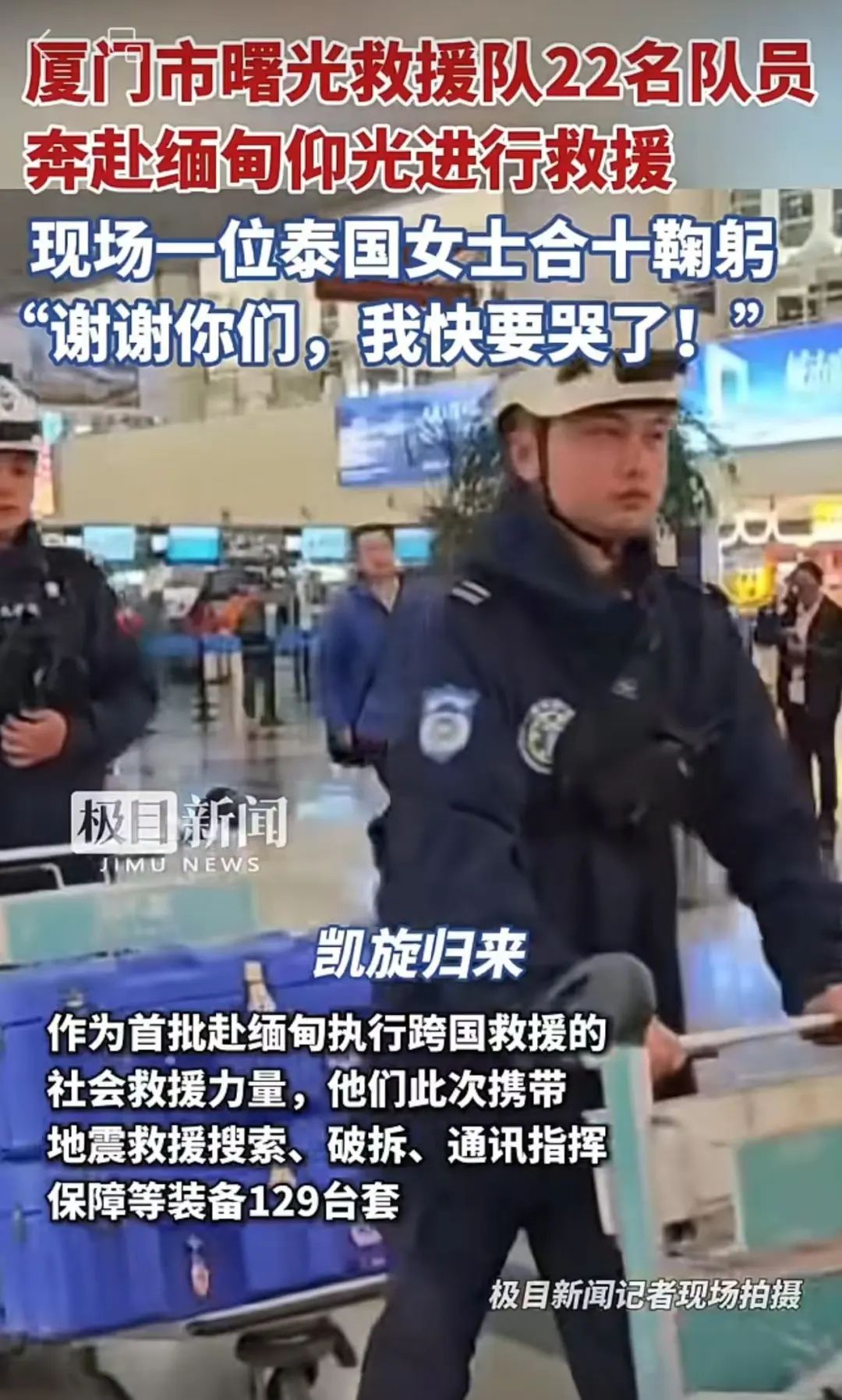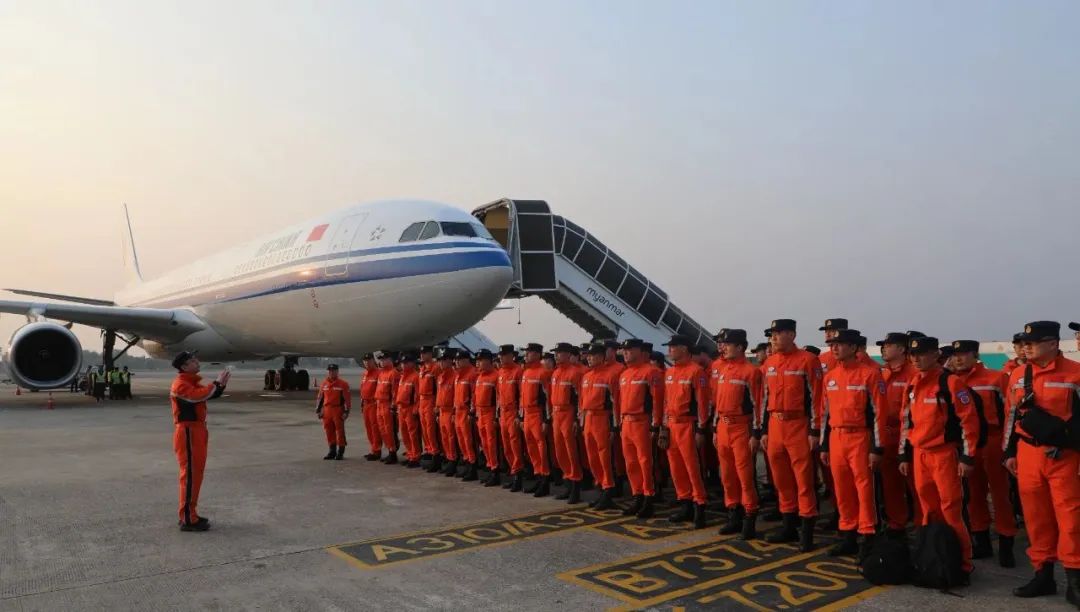 中國駐緬甸大使館發文介紹,當地時間3月29日下午4點10分,中國政府派遣的救援隊一行82人攜帶20餘噸通信、搜救、醫療設備和應急食品等應急救援物資,自北京千里奔襲抵達仰光國際機場。