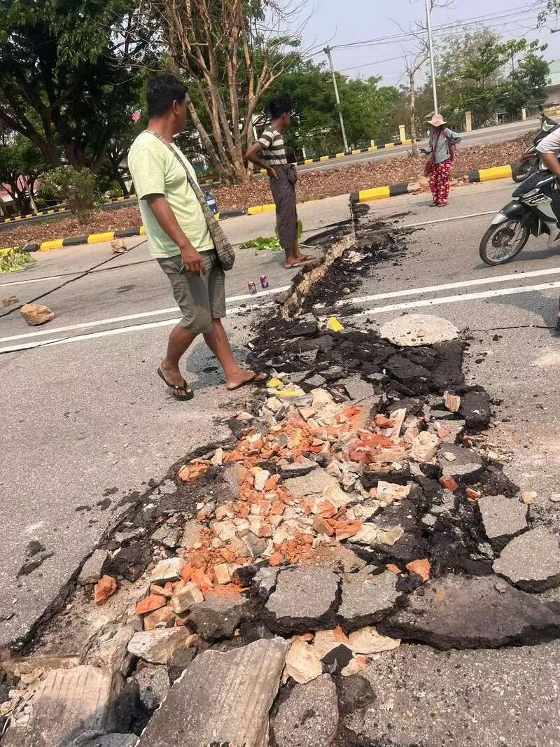 3月28日,強震發生後,緬甸首都內比都街道的地面開裂。劉翀/攝