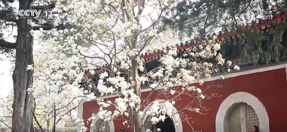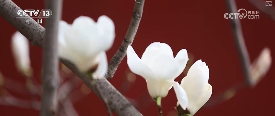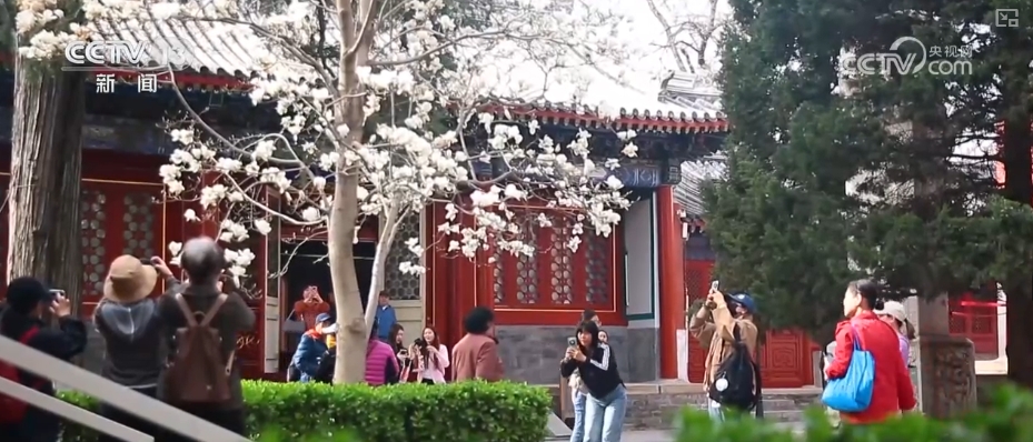近日,北京萬壽寺內的玉蘭花迎來了盛花期,素淨的玉蘭花在紅牆古建的映襯下韻味十足,賞花拍照的遊客絡繹不絕,以院內玉蘭為原型的文創產品銷售火爆。