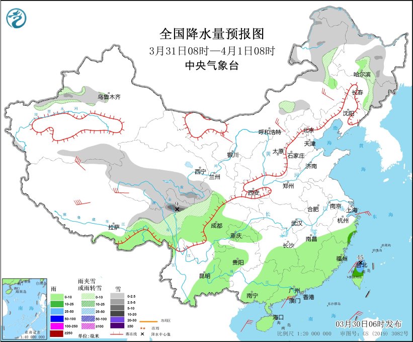 *3月30日08時至31日08時,*西藏東部、川西高原北部、青海西部、新疆沿天山地區、內蒙古東北部、黑龍江東部、吉林東北部等地部分地區有小雪或雨夾雪,其中,西藏東北部、川西高原北部等地部分地區有中到大雪,局地暴雪(10~15毫米)。西藏東南部、西南地區東部、江南中南部、華南大部、台灣島等地部分地區有小到中雨,其中,台灣島北部部分地區有大雨,局地暴雨(50~70毫米)。內蒙古中東部、華北北部、青海西南部、西藏中北部等地部分地區有4~6級風;東海南部、台灣海峽、巴士海峽、南海北部等海域有6~8級風(見圖1)。
