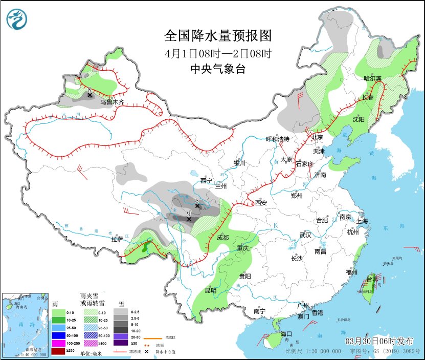 *4月1日08時至2日08時,*西藏東北部、川西高原北部、青海南部、新疆沿天山地區和伊犁河谷、內蒙古中東部、黑龍江北部、吉林東部、遼寧東部、河北北部等地部分地區有小雪或雨夾雪,其中,新疆伊犁河谷、青海南部、川西高原北部等地部分地區有中到大雪(5~9毫米)。內蒙古東部、黑龍江中東部、吉林中部、遼寧大部、山東半島、西藏東南部、四川東部、重慶西部、貴州西部、雲南東部、海南島、雷州半島、台灣島等地部分地區有小到中雨。內蒙古中部、華北大部、山東半島、西藏中北部等地部分地區有4~6級風;台灣海峽、台灣以東洋麪等海域有6~7級風(見圖3)。