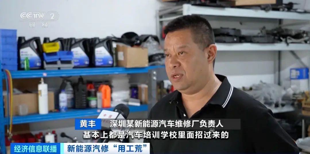 深圳某新能源汽車維修廠負責人 黃豐:招到有技術的人羣很難,基本是汽車培訓學校裏招過來的,因為你要學過以後才行。