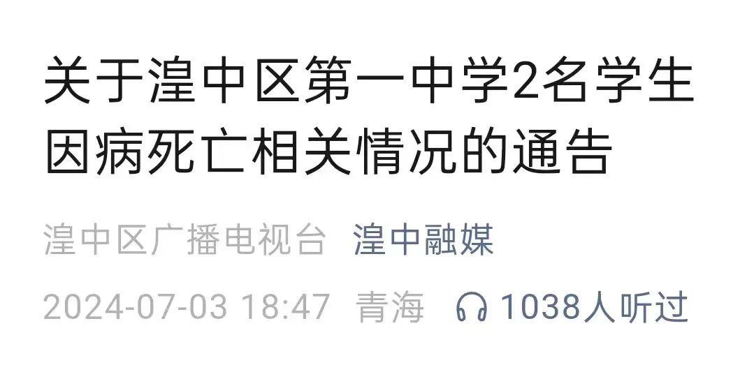 2024年6月5日、6月26日,青海西寧市湟中區第一中學八年級(5)班兩名學生先後因病死亡。7月3日,青海西寧市湟中區教育局、衞生健康局發佈通告,兩人的腦膜炎奈瑟菌血培養均為陽性。